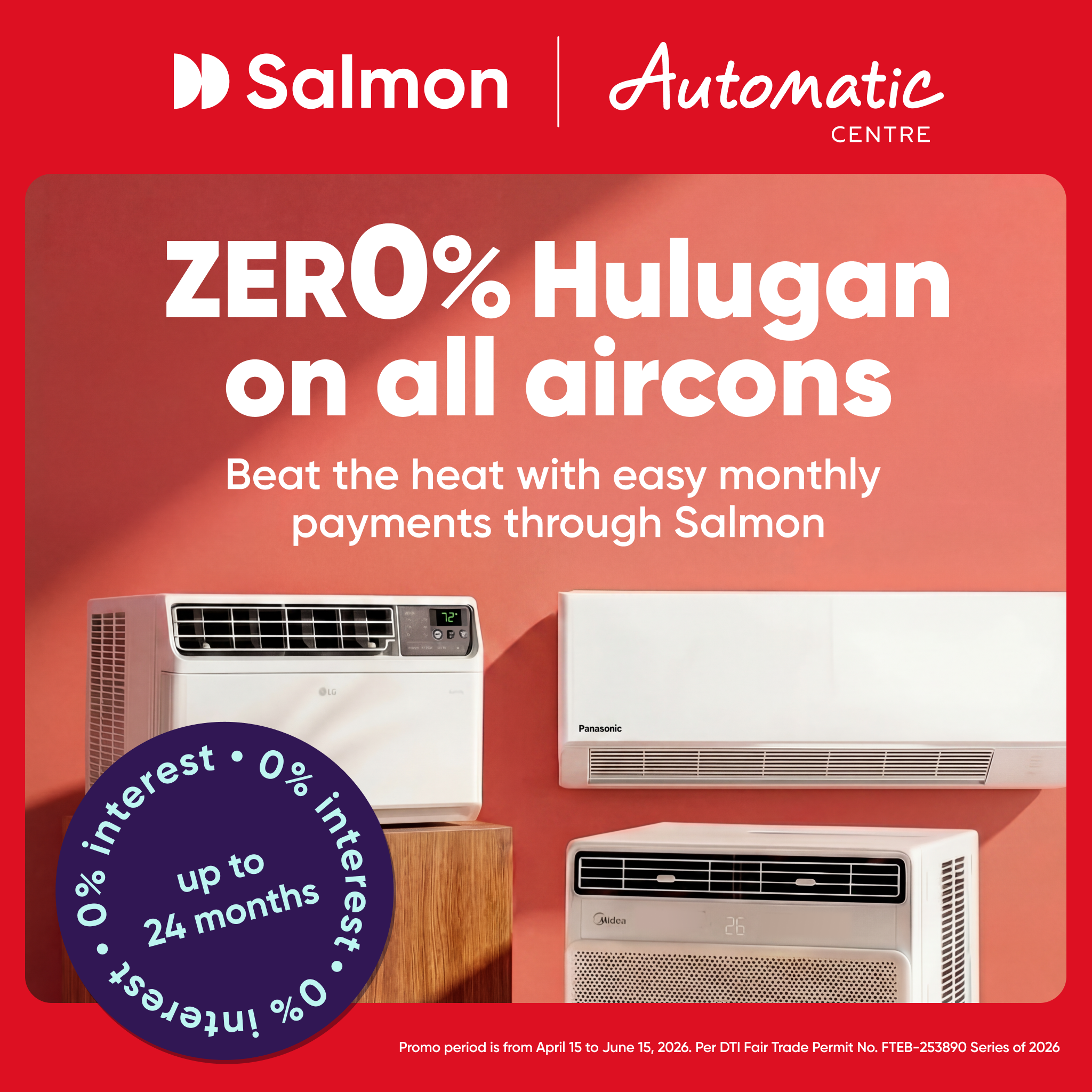 Eligible customers who purchase any brand or SKU of air conditioner (window or split type) using a Salmon Product Loan at participating Automatic Centre stores will be entitled to a 0% interest offer.